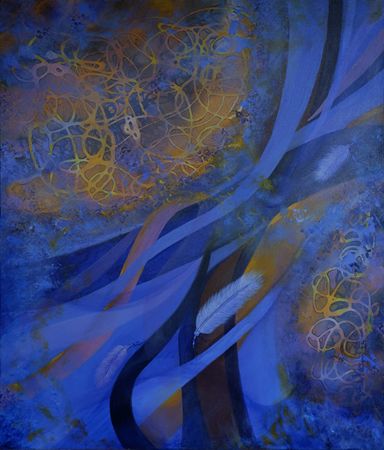 In her works, blue is not a backdrop to devotion but a spatial field in which matter, energy, and consciousness appear suspended. The paintings move between vortex and void, between cellular intricacy and cosmic scale. Spirals open like primordial galaxies. Orb-like forms hover as if embryonic worlds. Vein-like calligraphic tracings pulse across surfaces, suggesting neural networks, river deltas, or unseen cosmological diagrams. The language is abstract, yet unmistakably organic.